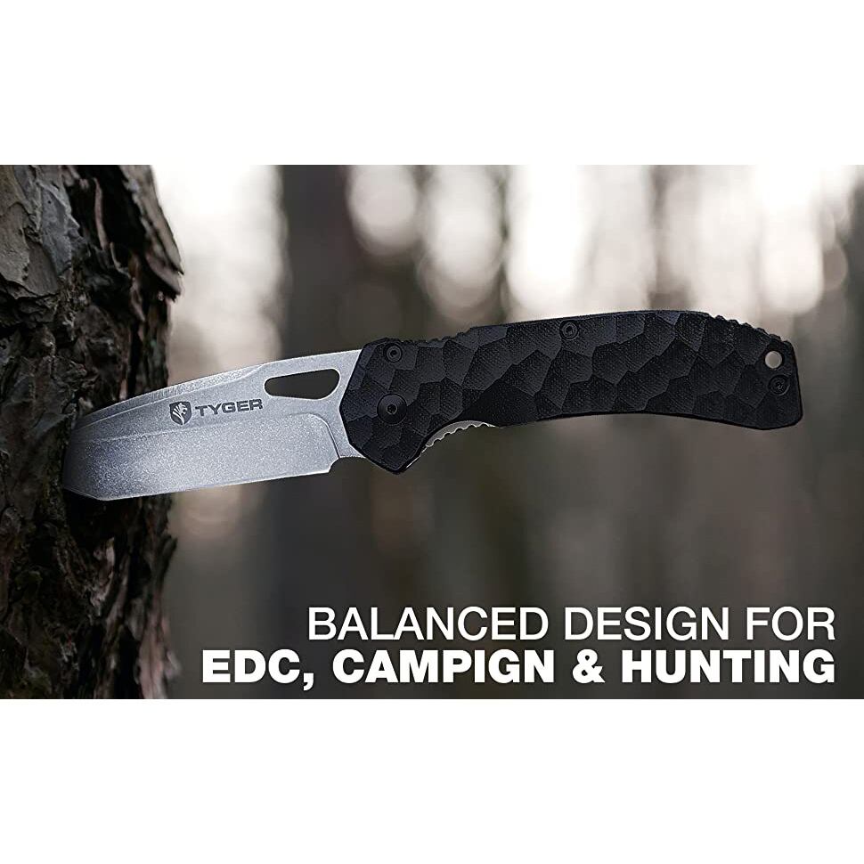 狩猟やキャンプなど、さまざまなシーンで利用可能。手に快適なフィット感を感じるように設計された4.8インチのチゼルロックパターンのハンドルで包まれた3.6インチのブレード